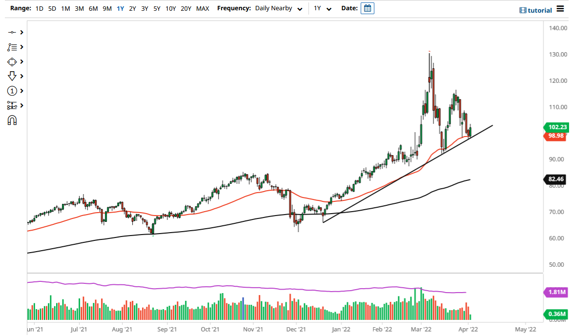 The war in Ukraine has also had an effect, as huge swaths of Russian oil are not going to make the market anytime soon. Because of this, it does take a certain amount of oil off the market itself and creates a supply and demand imbalance. This is a market that has been in an uptrend for quite some time, so one would think that there will be plenty of momentum underneath to continue to push to the upside. Looking at this chart, we have seen a massive amount of volatility into the market, but it is worth noting that the buyers continue to return.