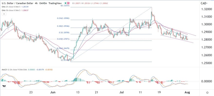The four-hour chart shows that the USD/CAD pair has been in a strong bearish trend in the past few days. As a result, the pair has formed a descending channel that is shown in purple. It has also moved below the 25-day and 50-day moving averages while the MACD remains below the neutral point.
