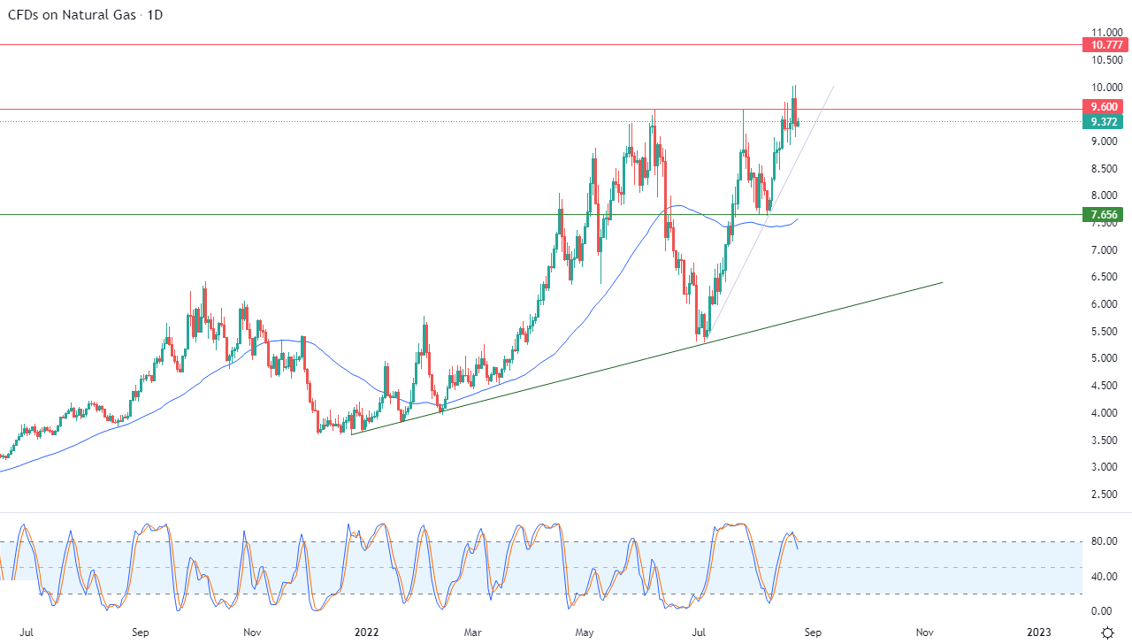 Spot natural gas prices (CFDS ON NATURAL GAS) stabilized at a decline in recent trading at intraday levels, to achieve slight daily gains until the moment of writing this report, by 0.96%. It settled at the price of $9.372 per million British thermal units, after sharply declining during trading. Yesterday, the rate was -5.24%.